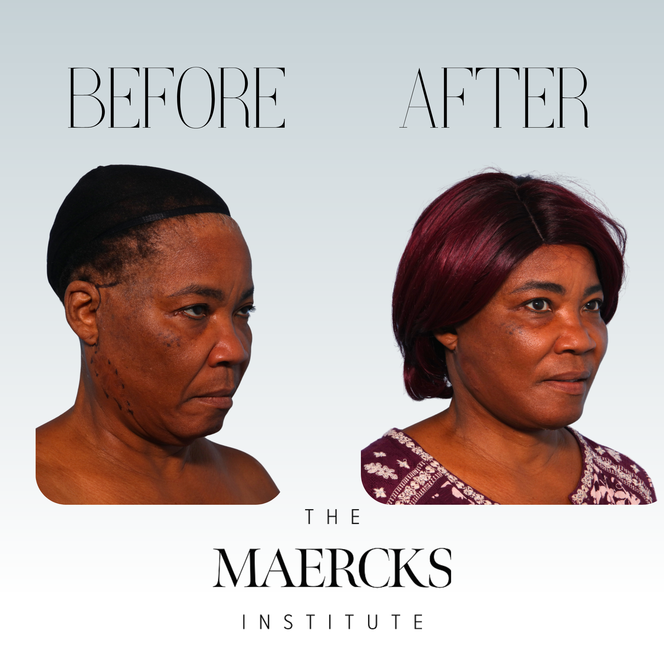 Recovery time at The Maercks Institute is typically very short, with many patients appearing presentable within one to two days. For example, some patients can go to lunch with their hair down the day after surgery, though there may be some visible findings around the ears.
